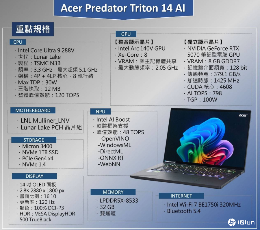 虽然强调轻薄设计,Triton 14 AI依旧维持高性能电竞笔记本的核心定位。不过在硬件规格上,Acer也针对实际使用与续航表现做了平衡。这次搭载的是Intel Core Ultra 9 288V处理器,属于专为轻薄旗舰笔记本设计的高端芯片,采8核心、8线程的混合架构,主打低功耗与高性能并存,Max TDP为30W。此外,处理器内置独立NPU,拥有高达48 TOPS的AI运算性能,能在低功耗状态下加速执行各类AI应用,像是形象强化、降噪或智能运算等都能更快更省电。