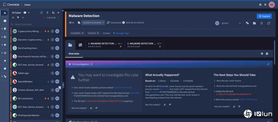 因为Chronicle SIEM和Chronicle SOAR的深度集成,用户现在可以在同一个控制台上获得更完整的上下文资讯,并切换查看警报、案例、调查和操作指南,简化威胁侦测、调查和回应流程(TDIR)。在Chronicle安全运营平台中,每个警报现在都被分组到一个案例中,以集成相关的警报,并提供访问相关数据的能力,协助安全团队更快做出决策。 应用威胁情报(Applied Threat Intelligence)新功能,目的是自动使用来自Google云计算、Mandiant和VirusTotal等情报供应者最新的威胁情报,使每一个安全事件的资讯更丰富,提供用户更多关于该事件的上下文,借以增进安全威胁侦测的准确性和效率。其运用人工智能技术,能够依据每个用户的环境评估和优先处理威胁。