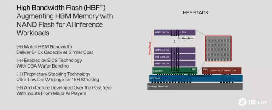 HBF采用SanDisk专有的BiCS NAND与CBA技术,将高层数3D NAND存储单元与高速逻辑层紧密堆栈,实现高带宽、低延迟且高密度的互联。
