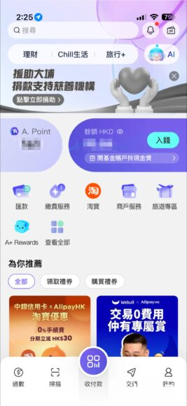 在AlipayHK主页上半部按援助大埔捐款支持慈善机构连接
