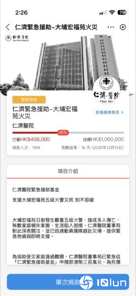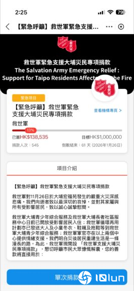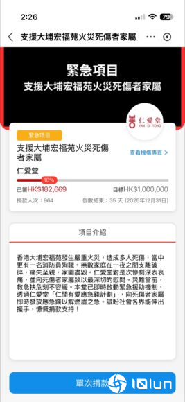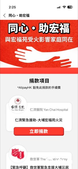 蚂蚁集团连同AlipayHK宣布首批捐赠1,000万港元,支持大埔宏福苑五级火紧急救援、过渡安置及生活物资补给工作。AlipayHK也于应用程序首页开设专项捐助信道,让市民即时参与多家慈善机构相关救援项目。