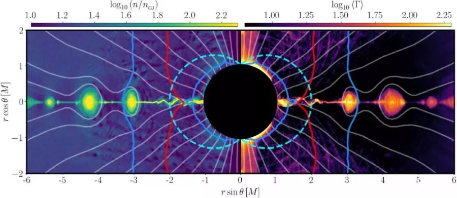 在黑洞赤道平面上的计算显示,发生了剧烈的磁重联现象,导致形成一串电浆粒团以近光速运动。研究人员指出,这一过程同时伴随着产生负能量粒子,这些粒子可用来驱动极端的现象,例如黑洞喷流与电浆爆发。