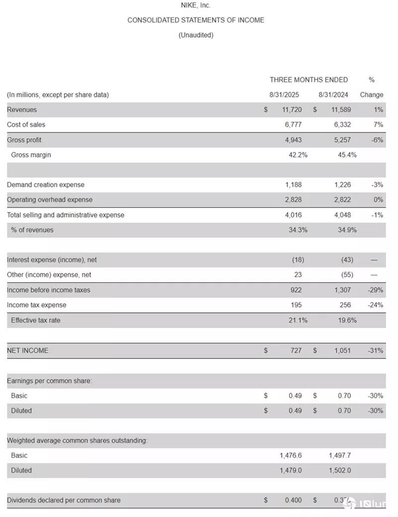 综合外媒报道,Nike于9月30日美股盘后公布,2026会计年度第一季(截至2025年8月31日为止),营收年增1%至117亿美元,优于公司原本预期的年减中个位数百分比,每股盈余49美分,也优于LSEG统计的分析师预估值27美分;受关税、折扣促销影响,毛利率下降320个基点至42.2%。