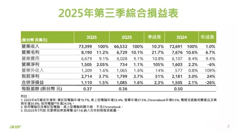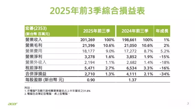 宏碁第三季总营收(台币,下同)733.99亿元、季增10.3%、年对年几乎持平;毛利 81.9 亿元、季增 21.7%、年增6.7%,毛利率11.2%;营业净利15.05亿元、季增105.1%、年减6%,营业净利率2.05%;税后净利11.1亿元、季增2.3%、年减26%;每股盈余0.37元低于去年同期0.5元。
