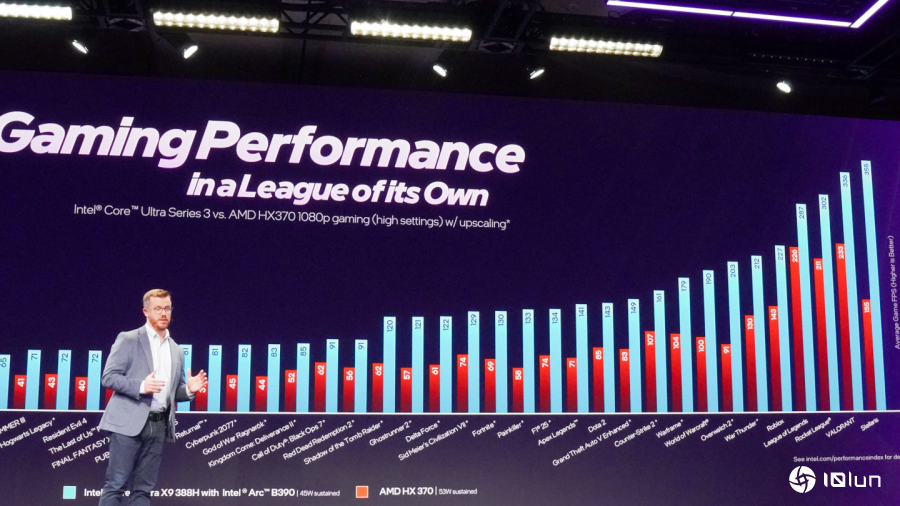 根据Intel提供的数据,Core Ultra X9 388H的游戏性能明显领先竞争对手AMD Ryzen AI 9 370。