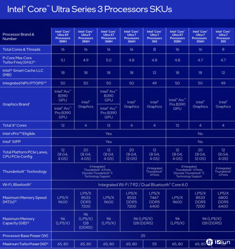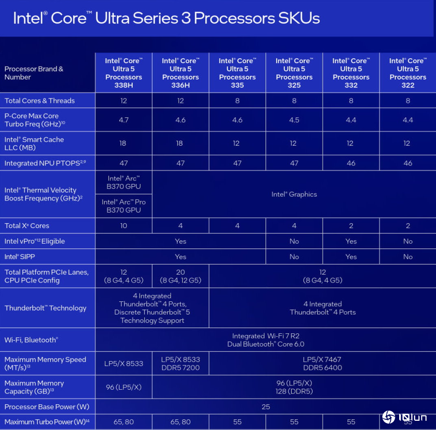 Core Ultra 3系列(Panther Lake)处理器规格列表。