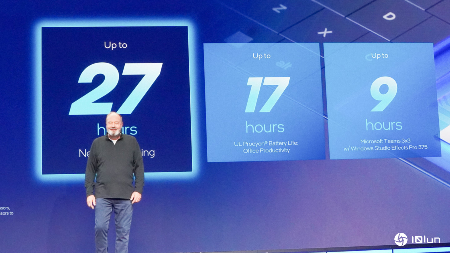 根据Intel官方提供的数据,搭载Panther Lake处理器的笔记本播放Netflix视频的续航力可达27小时,UL Procyon办公室模式测试以及打开Windows Studio Effect视频效果进行3x3 Team视频会议的续航力分别为17、9小时。