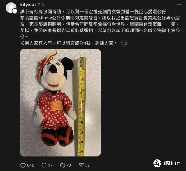 有网络用户在Threads分享,先前到大埔协助灾民遇到一名居于宏福苑家长,提到女儿在火灾中失去一只穿和服Minnie公仔。该公仔早已停产,家长当年需在网上“揾匀全世界”,最后才在台湾买到唯一一只,对女童别具意义。家长其后在旧相册翻出公仔合照,热心网络用户便把照片上传Threads,呼吁网络用户帮忙留意二手平台或收藏家,期望替女童再觅同款公仔。