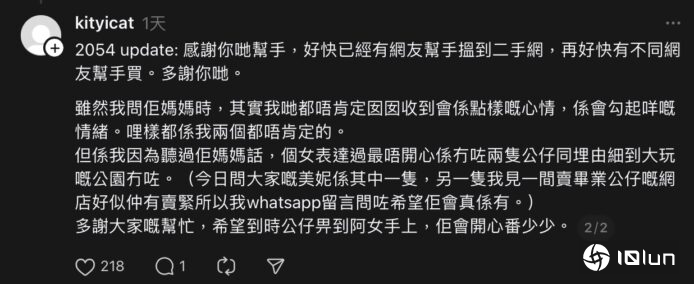原帖网络用户其后更新进度,感谢不同网友出手相助,指很快已有人在二手网成功买到公仔,也有其他网友主动联系,表示愿意从海外代购或捐出家中同款玩偶。不过他也透露,自己与女童母亲曾担心当女童再次收到Minnie公仔时,可能会勾起火灾经历。但相信女童最难过是同时失去两只陪伴多年的玩偶及熟悉公园,因此仍希望能把公仔送到她手上,让她在重建生活期间感到多一点支持。