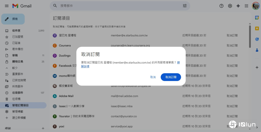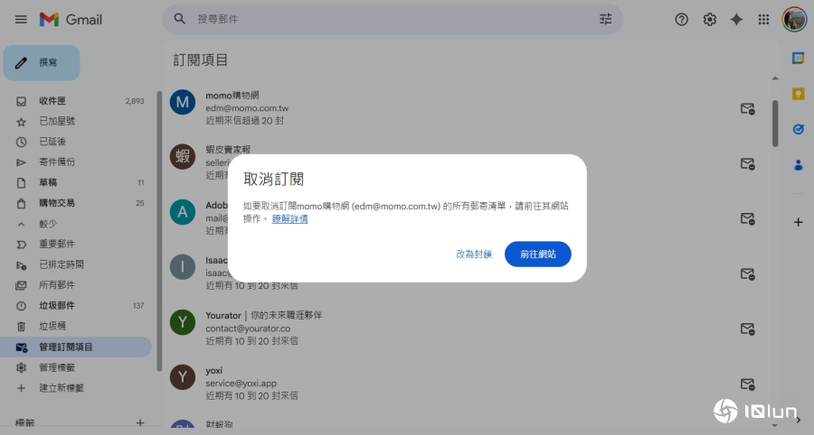 最后,如果确定要取消订阅,只要回到“管理订阅项目”分页,在想要退订的账号旁边就能看到“取消订阅”按钮。不过要特别留意,并不是所有寄件者都能直接在Gmail内完成退订。例如,下图中的“星巴克星礼程”可直接在Gmail操作取消,但“momo购物网”则必须前往其网站才能退订。不过Gmail也提供“前往网站”的连接,只要点一下,系统就会自动带你跳到能取消订阅的页面了。