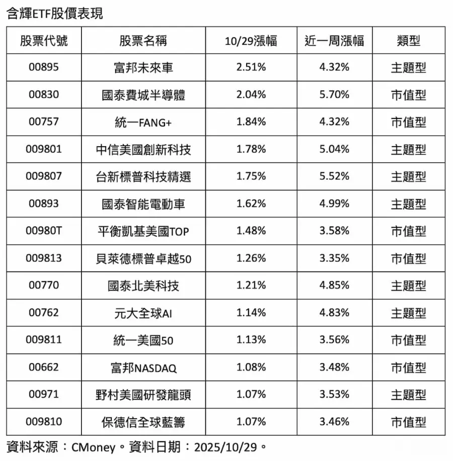 英伟达(NVIDIA)今日股价再创历史新高,市值一举冲破5兆美元大关,成为史上首家达到5兆美元里程碑的企业,台股ETF也跟着吃香喝辣,总计挂牌台股31文件含辉ETF中,单日上涨1%以上的就有14文件,包含7文件主题型、7文件市值型,近一周涨幅大多有3.5%以上。