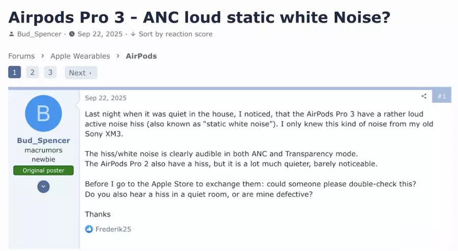 也有用户表示,在环境音低于30分贝时几乎无法听音乐,因为杂音太重,只有关闭麦克风才能让耳机变安静。不过并非所有AirPods Pro 3都受影响,有些人完全没有遇到问题,或对这类背景噪音不敏感。
