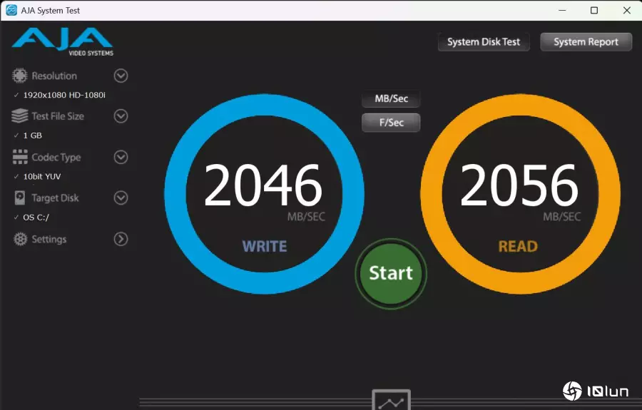 AJA System Test实测写入速度达2046MB/s,读取速度2056MB/s。