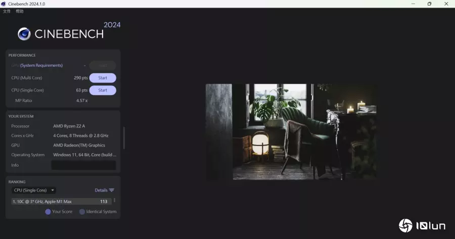 通过Cinebench 2024测得CPU单核63分、多核290分。