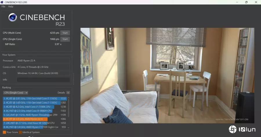 在Cinebench R23测试CPU单核获得1066分、多核达4235分。