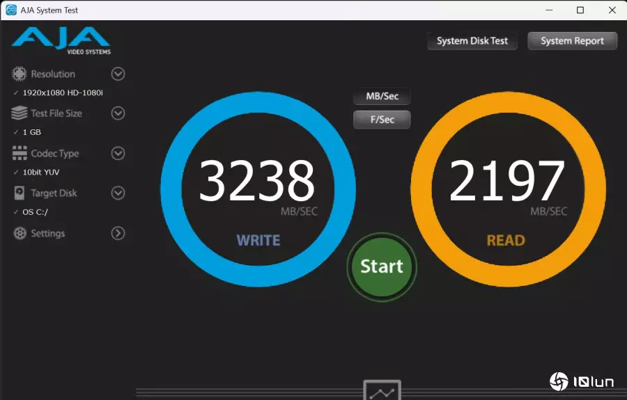 AJA System Test实测写入达3238MB/s,读取2197MB/s,SSD速度相当亮眼。