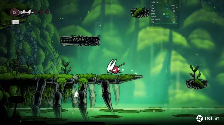 接下来再看看白色ROG Xbox Ally入门休闲掌机的实际性能表现,虽然它无法与定位更高的ROG Xbox Ally X相提并论,但在选择合适的游戏类型时──例如以2D或2.5D画面为主的独立作品──依然能发挥相当稳定的表现。再加上轻巧的机身与长效电池续航,整体使用体验在性能与便携性之间取得了不错的平衡。像是近期新上市的类银河战士恶魔城游戏《空洞骑士:丝之歌》,搭配120Hz的屏幕刷新率,画面就十分顺畅且丝滑,配合掌机的轻便与机动性,更方便玩家随时挑战关卡。
