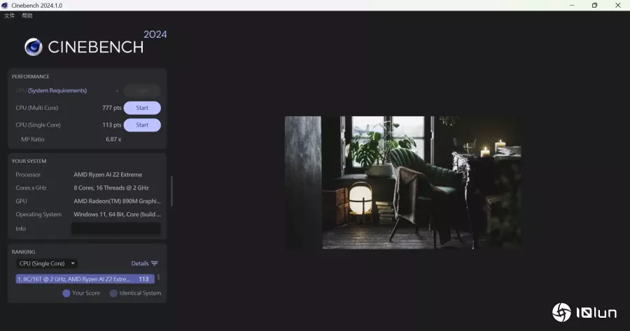 在Cinebench 2024测得CPU单核113分、多核777分。