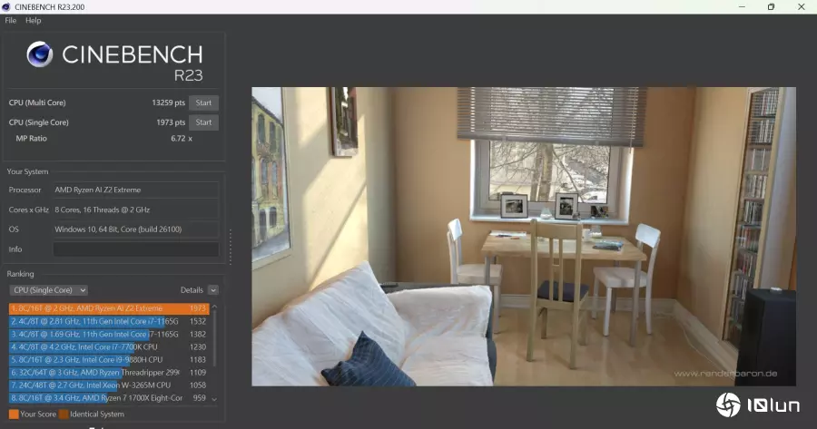 在Cinebench R23测试CPU单核获得1973分、多核达13259分。