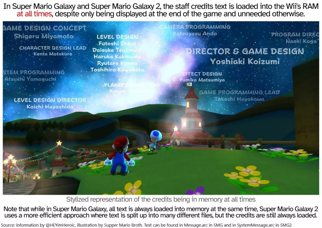 《超级马里奥银河》初代会在游戏开头便加载所有游戏文本,因此将制作人员名单常驻内存尚属合理。