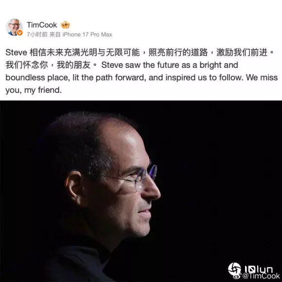 库克在微博中以中英双语发文:“Steve相信未来充满光明与无限可能,照亮前行的道路,激励我们前进。我们怀念你,我的朋友。”同时附上英文原文“Steve saw the future as a bright and boundless place, lit the path forward, and inspired us to follow. We miss you, my friend.”。
