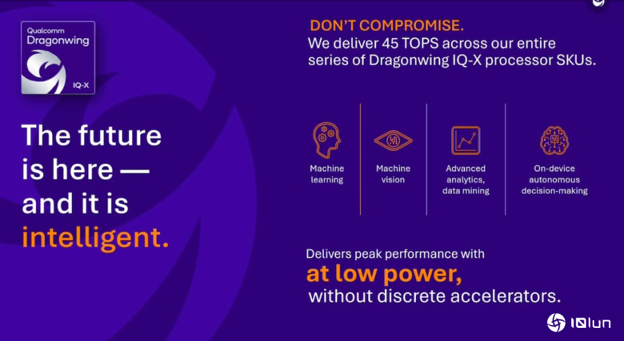 Dragonwing IQ-X系列核心搭载高通Oryon CPU,采4纳米制程技术打造,提供8至12个高性能核心的可扩展配置,及高达45 TOPS的AI运算性能。Dragonwing IQ-X系列支持工业级温度范围(-40°C至105°C),适用于严苛与恶劣环境。