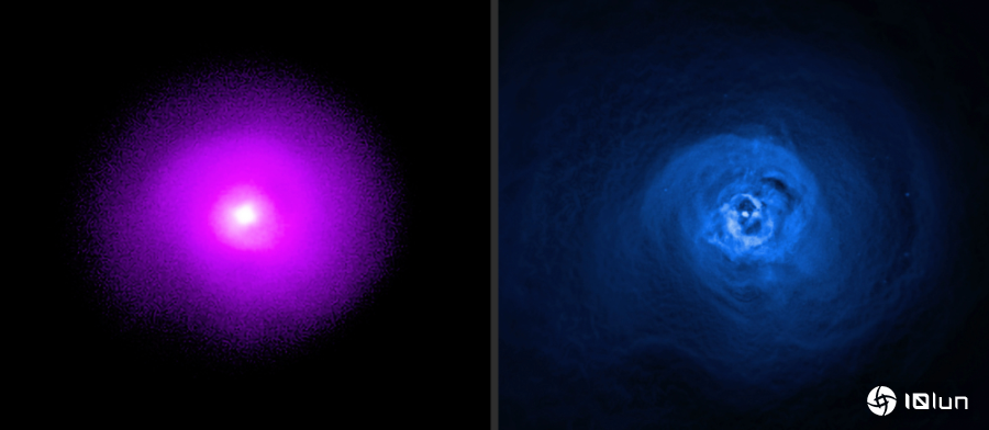 英仙座星系团的X光观测比较。此图并列呈现“X光偏振成像探测器(IXPE)”任务与“钱德拉X光观测卫星(Chandra X-ray Observatory)”对英仙座星系团的X光观测结果。研究团队结合IXPE所提供的X光偏振资讯,以及钱德拉拉的高解析成像能力,并搭配其他X光望远镜的观测数据,得以在星系团内大量高温气体所形成的复杂背景中,分离出核心活跃星系3C 84所发出的X光信号,并确认其偏振测量结果。(Source:NASA)