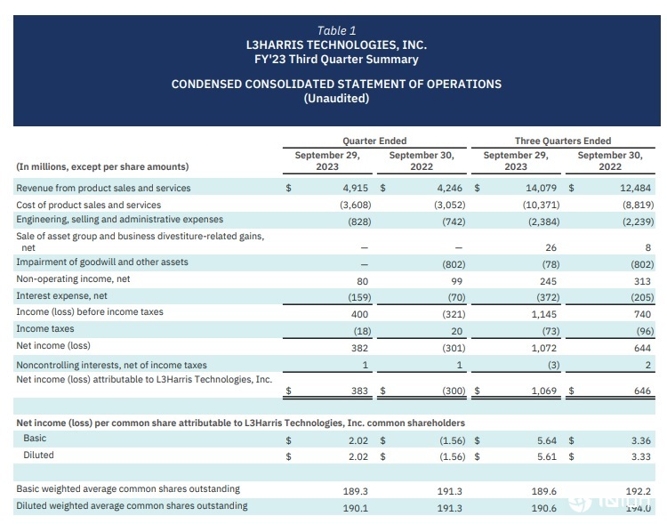 L3Harris接获的订单在Q3 (截至9月29日)累计至50.1亿美元。