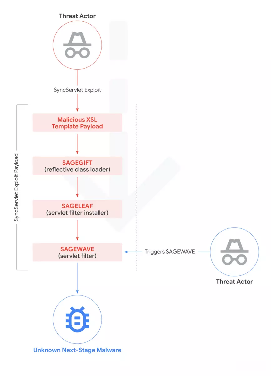 这条攻击链如何组成?Mandiant表示,XSL酬载内置用Base64编码包装的Sagegift酬载,Sagegift本身是个针对Oracle WebLogic服务器而写成、加载Java反映类别的程序;Sagegift会加载Sageleaf酬载,Sageleaf是内存内执行的投放程序,本身也是基于动态加载Oracle WebLogic servlet的公开程序代码而成;Sageleaf会加载Sagewave酬载,Sagewave本身是Java servlet过滤器,能让攻击者部署一个内置多个Java类别的AES加密ZIP压缩文件,单就Sagewave的主要酬载而言,也被认为与2024年攻击Cleo事故出现的后门程序Goldtomb的CLI模块有关。