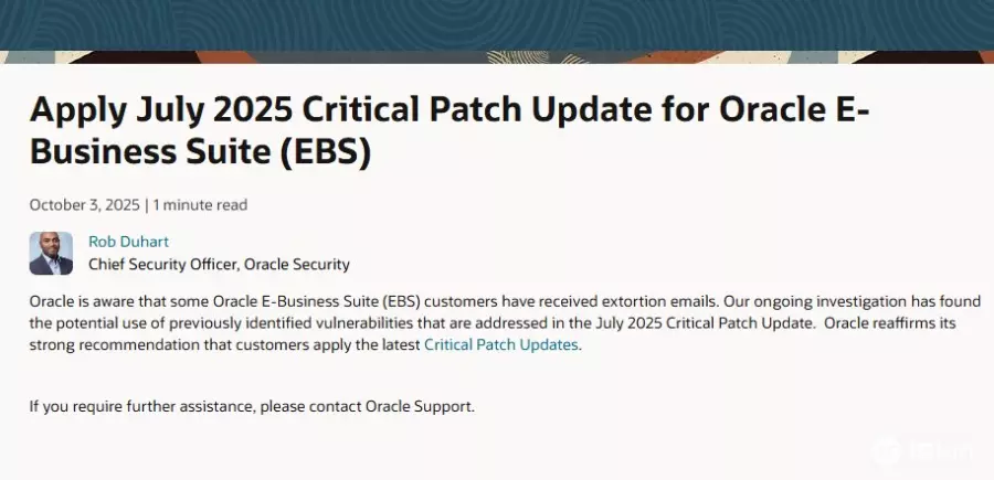 这个月初,Google向多个新闻媒体披露多家企业可能面临一波勒索软件攻击的事故。有个附属于勒索软件组织Clop的团体寄敲诈信给多家企业主管,声称他们窃取这些公司放在ERP软件Oracle E-Business Suite(EBS)的敏感数据,希望企业能与其讨论赎金,否则部分数据将卖给地退市场,其余将发布至他们的博客,而且公开至P2P下载软件BitTorrent的tracker服务器,Google威胁情报团队(GTIG)与安全应变顾问单位Mandiant已介入调查。几天后,Oracle发布博客文章,起先表示得知有用户收到敲诈信,初步调查认为攻击者可能利用今年7月披露与修补的一批漏洞,之后又改口语是新披露的漏洞CVE-2025-61882可能遭滥用,并为其发布安全公告,令外界搞不清楚状况。