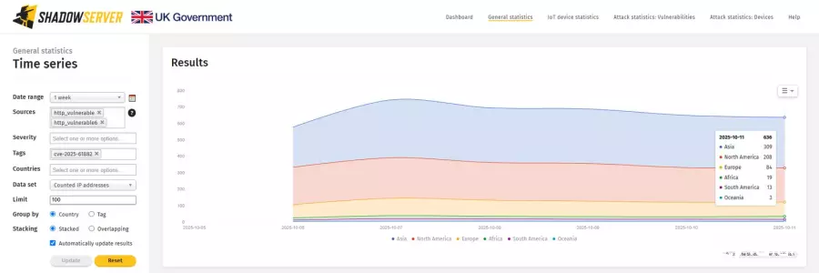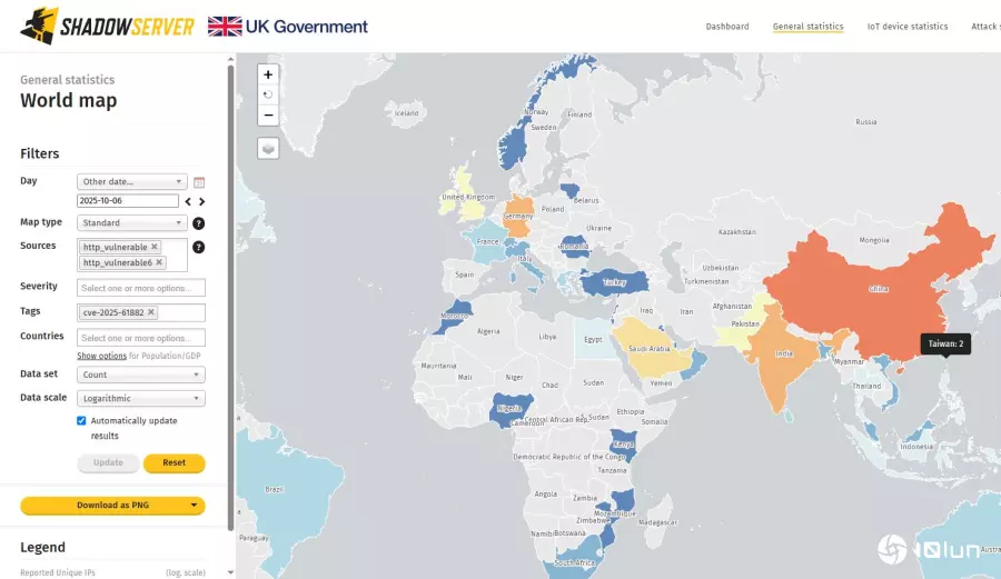 关于CVE-2025-61882在公开网络的曝险状态,Shadowserver基金会也在10月7日披露他们观察的结果:全球总共有576台系统存在这个漏洞,它们都可能是受害者,而在后续几天的曝险总量上,也呈现先增长后缓退下降的趋势:10月7日有742台系统,之后减至694台、687台、648台,10月11日是648台,台湾从10月6日至11日一直都是两台系统曝险,显示存在潜在风险的企业并未采取有效的处理作为。