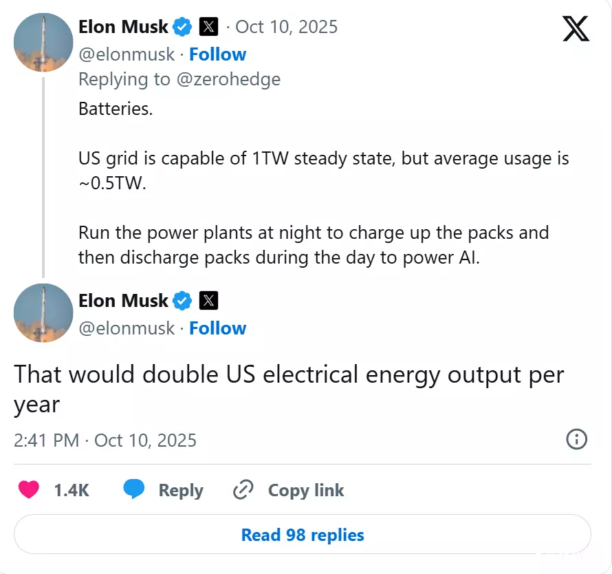 他指出,美国电网虽具备约1兆瓦(1TW)的稳定供电能力,但实际日常用电平均仅为0.5兆瓦(0.5TW)。“让发电厂在夜间持续运转、帮电池充电,白天再放电给AI使用,”马斯克强调,这种做法将有效放大整体供电量。