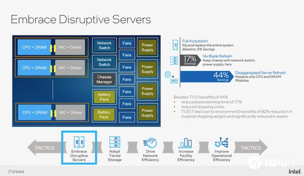 在服务器方面,英特尔IT研发一种解构式服务器(Disaggregated Server)专利,他们在数据中心内采用刀片式服务器,提来密度,并将服务器内的CPU及DRAM独立出来,汰换服务器时只要更换CPU及DRAM,保留网卡、硬盘等其他组件,和传统汰换整台服务器的做法相比,可节省约44%成本。