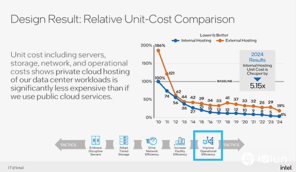 他们从2010年开始比较相同算力资源条件下,自行运维管理数据中心的单位成本,和改用云计算服务的单位成本相差多少,根据英特尔IT的统计,英特尔自行运维管理数据中心的单位成本,如果将2010年定为基数(100%),2024年单位成本已降到4%,云计算服务在此期间单位成本也不断降低,从2010年的186%降到2024年的19%,明显云计算运维管理的单位成本降低许多,但英特尔自己运维管理数据中心单位成本降到4%,两者成本相差5倍。