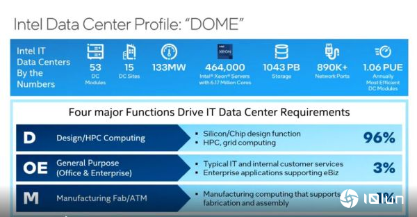 其中“D”代表Design/HPC,为英特尔芯片设计、量产前的工作负载,这部分的运算工作负载占英特尔96%的服务器;而“OE”则代表一般办公室或企业运营的Office&Enterprise,这类运算负载为典型的IT运算,要求较高的SLA,但仅占3%服务器;“M”代表Manufacturing Fab/ATM,主要为支持工厂自动化的工作负载,大多位于工厂附近或周边,仅占1%服务器。
