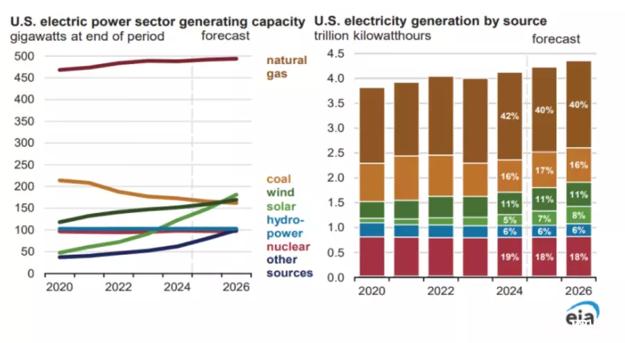 EIA预测,美国电力结构将持续朝低碳化与多样化方向发展。 2025年再生能源占比将达25%,2026年进一步升至26%;天然气与核能则维持相对稳定,分别约40%与18%。