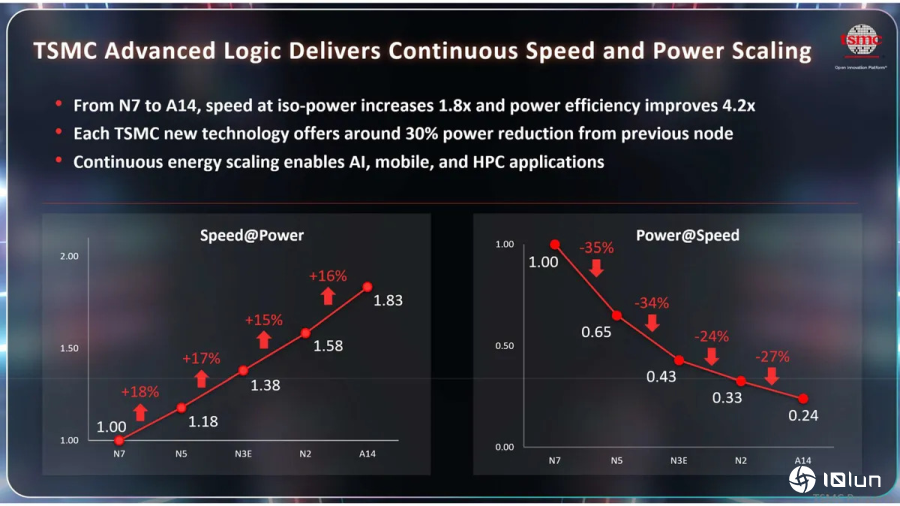 台积电指出,从N7(2018年技术)到A14(2028年技术),性能在相同功耗下提升了1.83倍,功率效率提高了4.2倍,这个数据令人印象深刻。台积电强调,A14相较于近期的N2制程能实现约30%的功耗降低,而性能提升则通常限制在15%至18%之间,这显示出在设计这些制程技术时,功耗的降低是台积电的主要关注点。