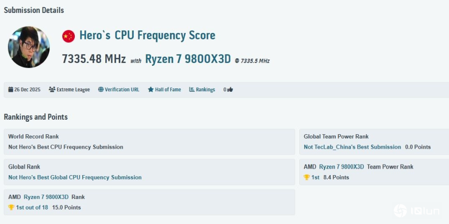最近,来自中国的超频高手“Hero”成功将AMD Ryzen 7 9800X3D处理器超频到惊人的7335.48MHz,一举登上HWBot排行榜首位,刷新了这款处理器的全球最高频率记录。先前这项记录是由超频大师hicookie以7313MHz成绩保持,而这次Hero则是凭借着更高的核心倍频,将记录再往上推升了约22MHz。
