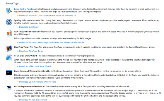 仔细看看PowerToys的页面,里面甚至包含了当年的同步神器“SyncToy”,以及让文件总管可以直接预览RAW文件的“RAW Image Thumbnailer and Viewer”。此外,像是早期的Windows说明文件,或是玩老游戏必备的DirectX Runtime函数库,这里也都一应俱全。