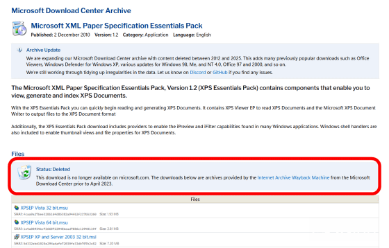以能够生成与读取XPS文件的“XPS Essentials Pack”为例,虽然微软官网早就撤掉了,但该网站通过Internet Archive的“Wayback Machine”时光机功能,成功把文件找了回来并提供下载。网站上也清楚标示了这些文件的来源。不过编辑也要提醒大家,这些软件与操作系统大多已过质保期,安全性更新也早已停止,下载使用前请务必评估安全风险,后果得自行负责。