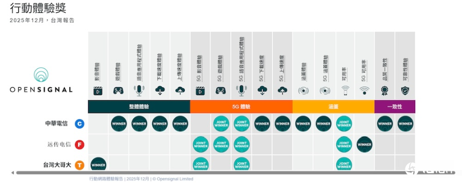 移动网络测试机构Opensignal稍早公布《2025年12月台湾移动网络体验报告》,针对台湾三大电信企业中华电信、台湾大哥大与远传电信,在整体体验、5G表现、涵盖与一致性等面向进行评比。从获奖结果来看,中华电信在多数关键指标上展现明显优势,台湾大哥大则在影音体验表现突出,而远传电信则在5G可用性指标上取得领先。