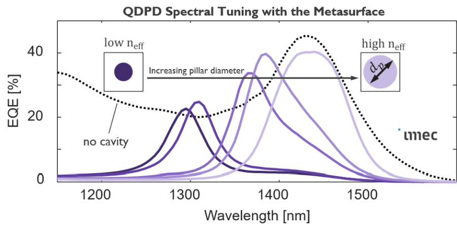 而imec成功在其12英寸CMOS试验制程开发的超颖表面共集成了胶体量子点光电二极管(colloidal quantum dot photodiode)来应对这项挑战。量子点是纳米等级的半导体,可以通过调整来吸收特定的红外线波长,而超颖表面是具备纳米图形的超薄组件层,精准控制光线如何与传感器发生作用。通过在与CMOS兼容的制程中结合这些组件,imec已经制出一套用于微型化SWIR光谱检测器的可调式平台,提供可利用标准CMOS制程制造的紧凑型高解度传感器架构。