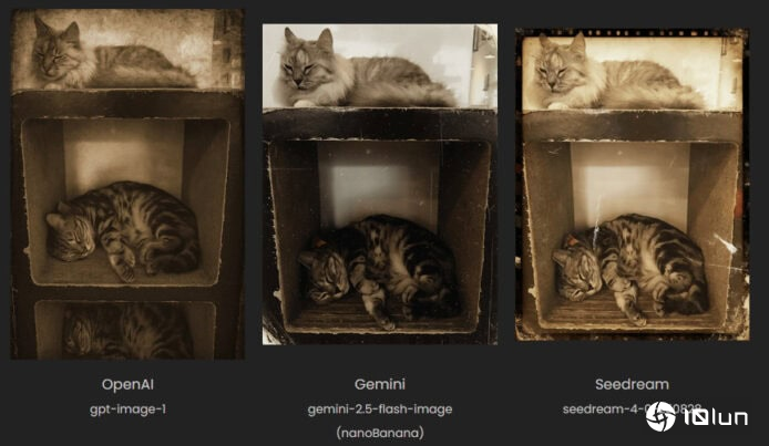 测试中以“肮脏复古照片”(Grungy vintage photo) 指令编辑猫照片时,gpt-image-1能灵活配合指令进行编辑,但有时会过度偏离原本构图。Nano Banana则过度保留原始形象资讯,导致编辑效果较弱。seedream-4-0-250828的表现介于两者之间。