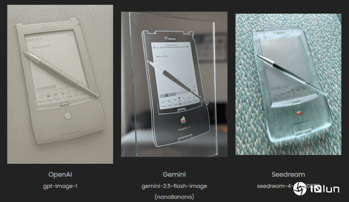 生成比较像玻璃的风格测试(Make it look like the photo is etched in glass)中,只有seedream-4-0-250828模型可以造到产品像玻璃制一样,其他都有理解不正常的问题: