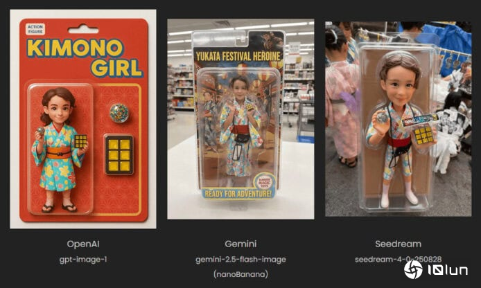 在“变成泡壳包装内的动作人偶”(Turn them into an action figure in the blister pack) 测试中,3款模型各有特色:gpt-image-1采用较夸张变形画风,Nano Banana维持原始姿势与体型,seedream-4-0-250828则介于两者之间。
