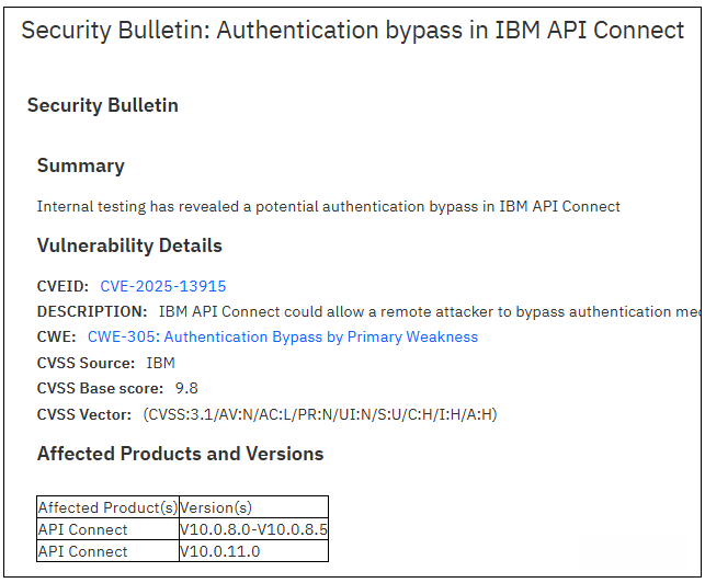 编号CVE-2025-13915的漏洞存在API Connect,可让远程攻击者绕过验证机制访问应用。IBM API Connect为企业级API管理(API Management)平台,提供API生命周期管理、负责验证把关的API网关及开发者门户网站(Developer Portal)。