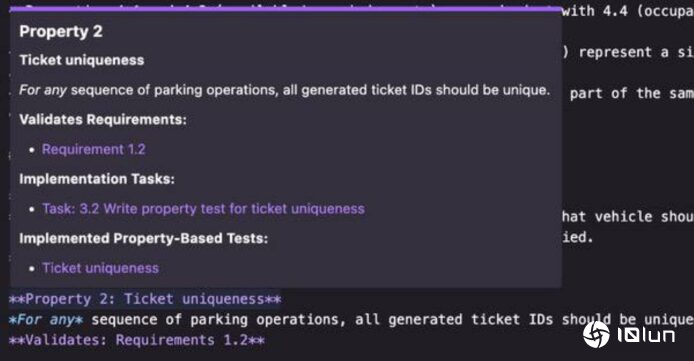Kiro会根据用户的Specs提取系统应有行为的通用属性,并生成大量随机测试用例,针对代码进行全方位测试。例如: