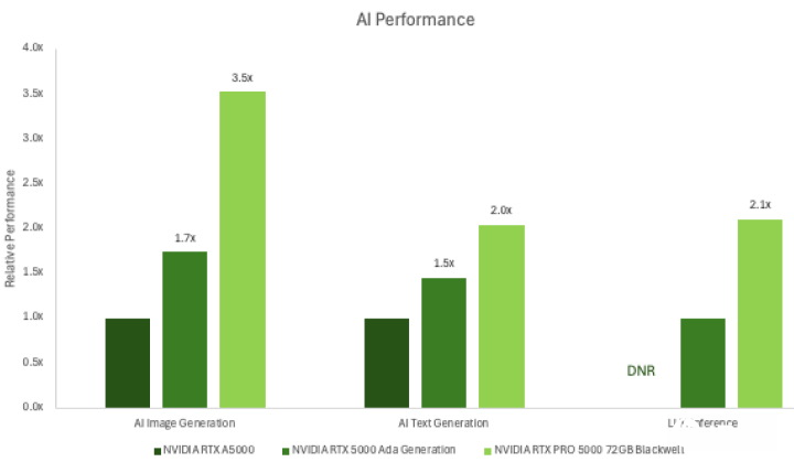 与先前时代的RTX PRO 5000 Ada、RTX PRO 5000相比,RTX PRO 5000 72GB Blackwell在AI图像生成的性能提升可达3.5倍。(图表中之DNR代表Do Not Run,无法执行)