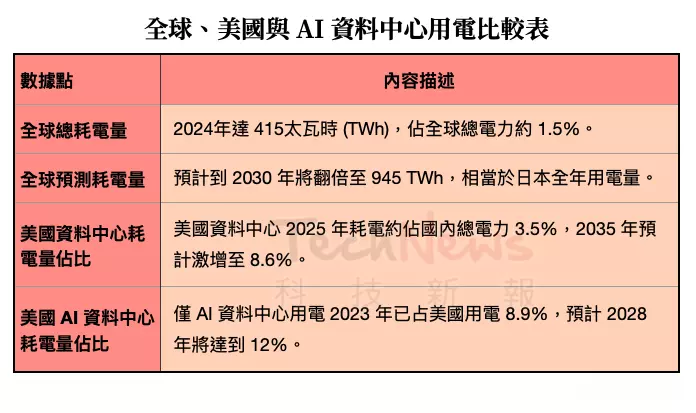 数据中心是现代数字经济的基石,负责处理和存储大量数据。根据国际能源总局(IEA)2025年报告,全球数据中心2024年耗电量已达415太瓦时(TWh),约占全球总电力1.5%,预计到2030年将翻倍至945 TWh,相当于日本全年用电量。美国数据中心2025年耗电约占国内总电力3.5%,2035年预计激增至8.6%。仅AI数据中心用电2023年已占美国用电8.9%,预计2028年将达到12%。这使得数据中心成为能源消耗的主要来源之一。
