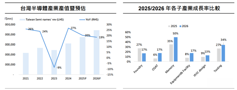 - 测试需求激增:AI芯片失效的成本极高,促使产业必须提供完整的测试项目覆盖,以提升终端运行的稳定性。测试产值预计在2026年将扩张至34%的增长率,达到1,156亿元。
